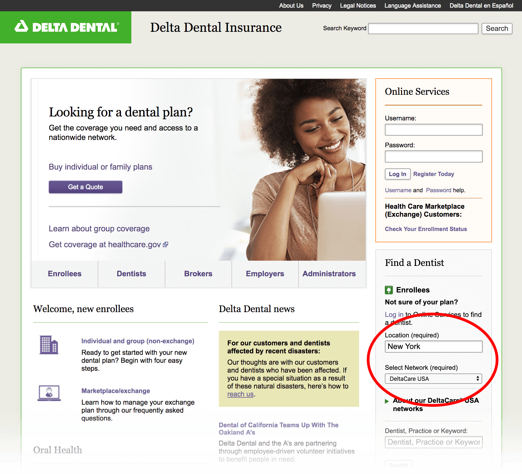 To find a participating DeltaCare USA dentist in New York, you will first need to enter a location in New York as your location and select “DeltaCare USA” as your plan. (See example image below.) If you do not select the DeltaCare USA Plan and a location in New York before searching for a provider, the dentists who appear on the results page may not be considered in-network for this plan.