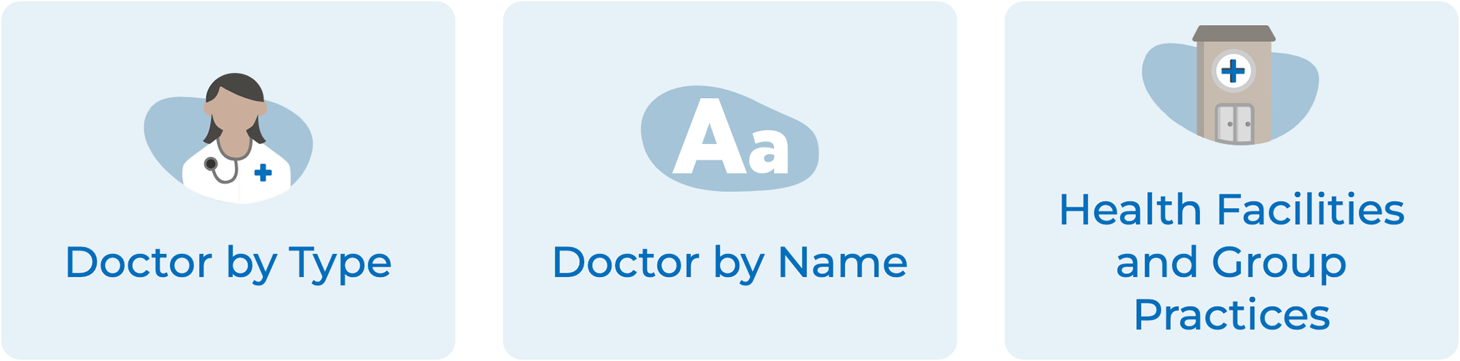 Step 2: Select “Doctor by Type” to search for doctors and specialists by type. Select “Doctor by Name” to search for providers by first or last name. Select “Locations” to search for hospitals, facilities, labs or pharmacies by type or name.